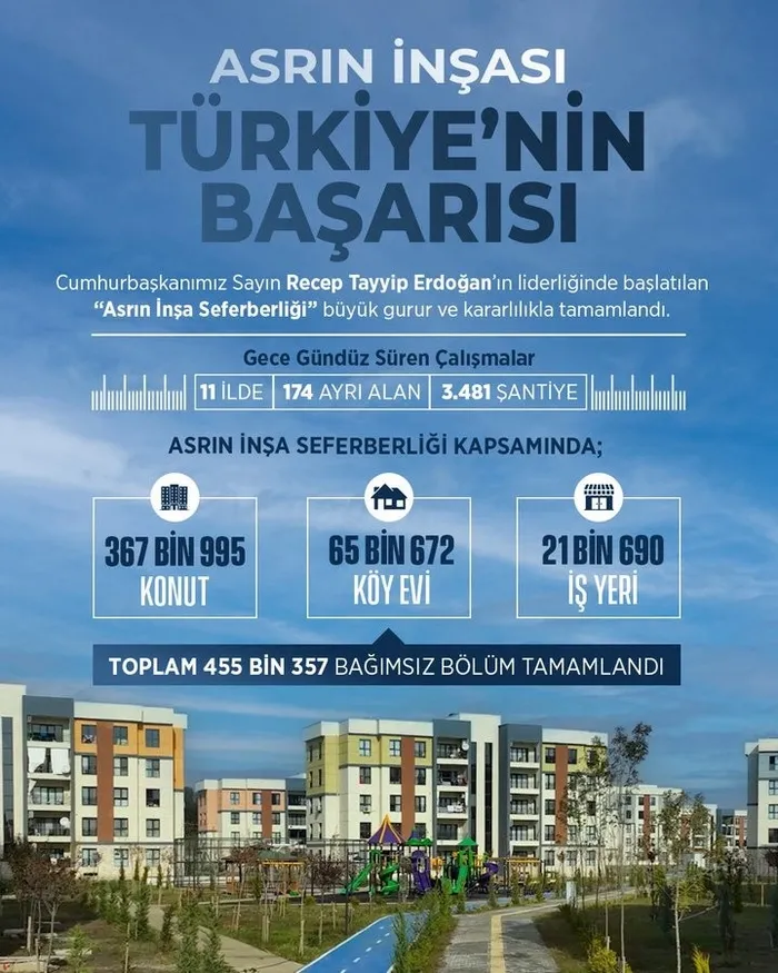 6 Şubat depremleri, 108 bin kilometrekarelik alanda 14 milyon kişiyi etkiledi. 50 binden fazla kişi hayatını kaybetti. Depremin ardından asrın inşa seferberliği, Başkan Recep Tayyip Erdoğan’ın talimatıyla Çevre, Şehircilik ve İklim Değişikliği Bakanlığı koordinesinde başlatıldı. 11 ilde, 174 ayrı noktada, 3 bin 481 şantiye kuruldu. 200 bin personel gece-gündüz ter döktü. Neredeyse Litvanya nüfusuna eşdeğer kişiye, Bulgaristan yüzölçümü kadar alanda yeni konutlar yapıldı.